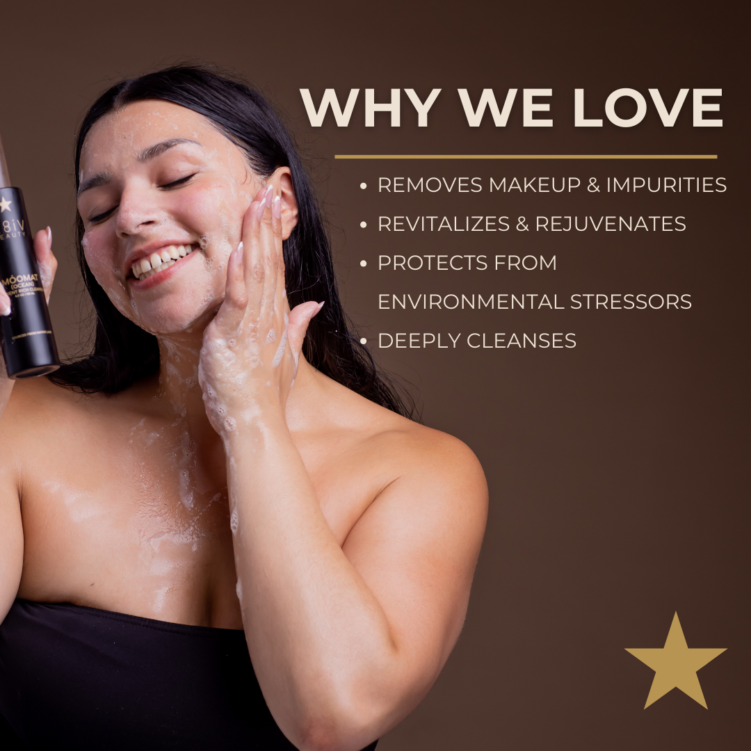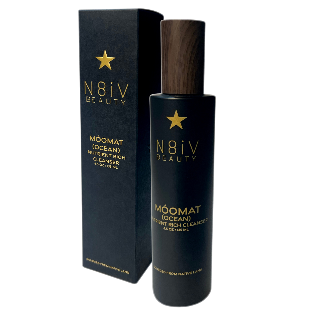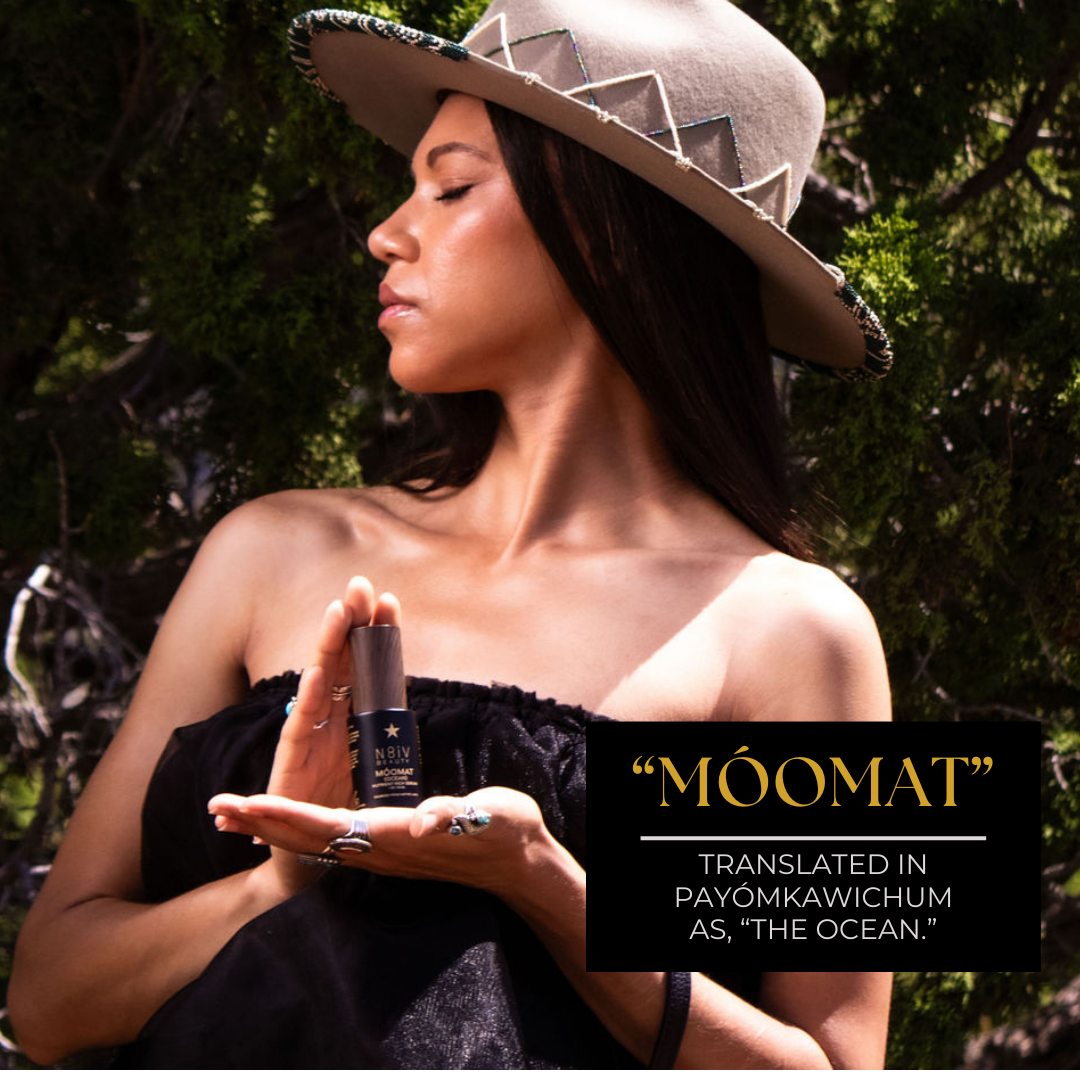 Móomat, translated as "Ocean", in Payómkawichum. These are two hero products that serve to cleanse the skin and rejuvenate with a deeply nourishing serum.