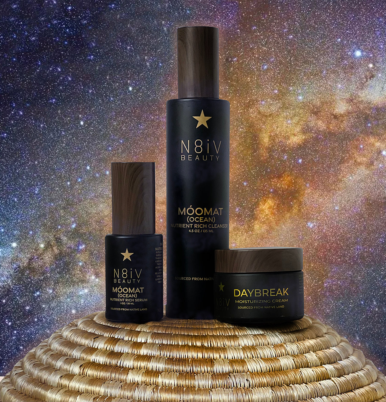 This skincare bundle features the Daybreak Moisturizing Cream, Móomat "Ocean" Nutrient Rich Cleanser, and Móomat "Ocean" Nutrient Rich Serum.